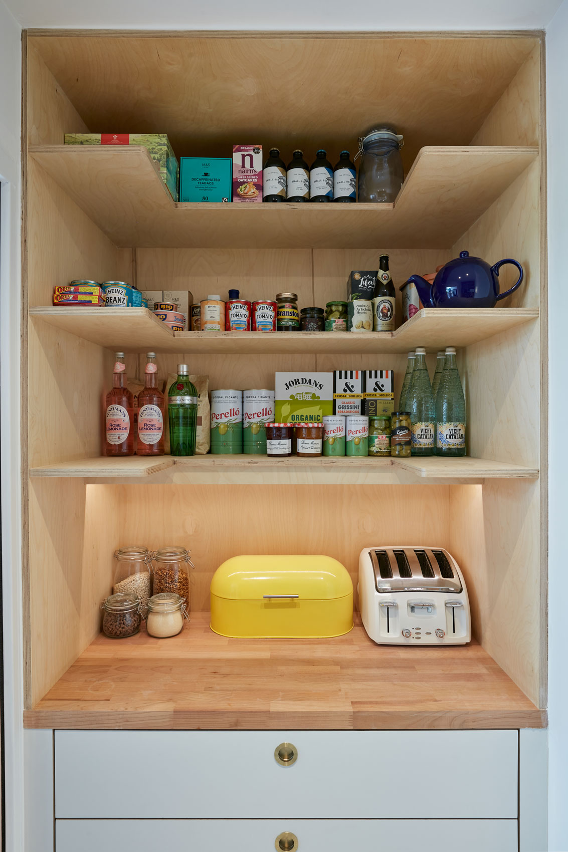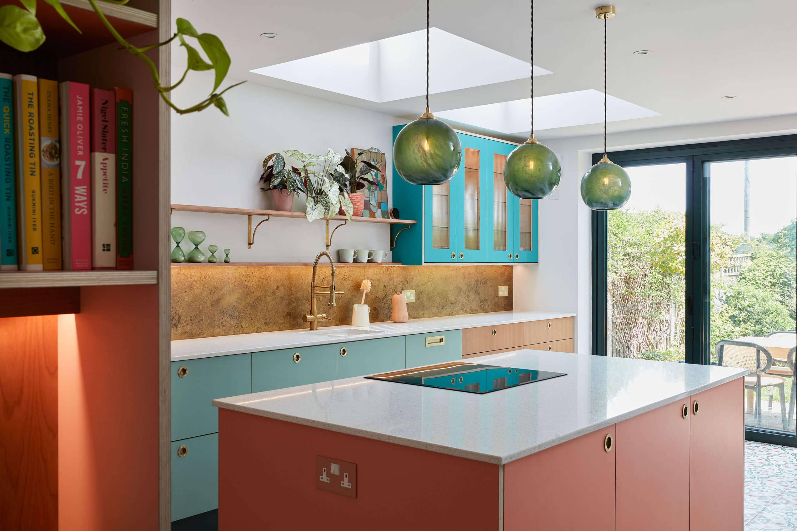 It all started with a patterned tile our clients had fallen in love with on holiday abroad. They knew they wanted to use something similar for their kitchen/diner redesign, as well as abundant colour & lots of interesting textures & finishes. So we carefully selected colours, then custom-designed the floor tiles, whilst in parallel refining the new layout design to be incredibly practical for a keen cook, but also safety-proof for young kids at large. All units were custom-joinered on site with integrity & care. All finishes are handmade & bespoke to the project: a rose-marbled brass splash back, hand-blown green swirled glass pendants, cherry wood & pop-bright laminated birch ply units, custom-made floor tiles. The end result is a thoroughly beautiful, fully bespoke & utterly practical kitchen.