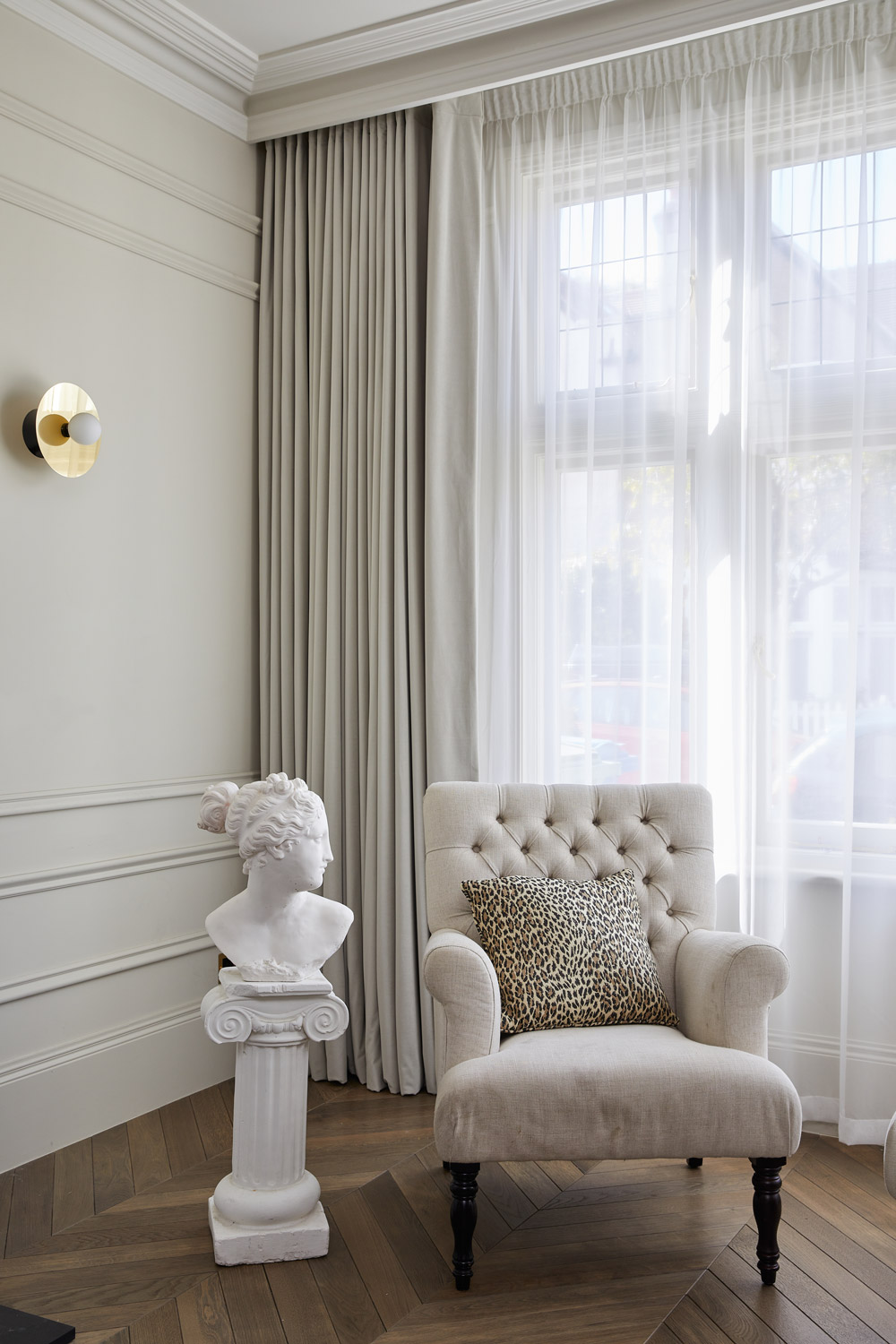 A full-house renovation of a 5-bedroom Arts & Crafts property in the heart of Dulwich Village for a young (and expanding) family. Our lovely clients had very specific ideas of what they wanted to achieve, but needed asssistance & guidance to make this all happen for them. The look was to be elegant & sophisticated, and the entire house needed to flow together as one. And aside from that, with 2 young children (and a new baby born throughout the course of the project!), the interiors needed to be safe & forgiving spaces that allowed for comfortable family living. The ground floor was opened out, with a rear kitchen extension & sliding pocket doors for a seemless effect. The kitchen & bathrooms were all custom-designed with marble surfaces & brass fixtures, and walls & ceilings were freshly ebelished with deep profile moulding & corncing to add rich & luxuriant detail. To create the full-house seemless flow, we chose a very tight & repetitive colour palette of soft greys & warm whites for an airy & serene feel.