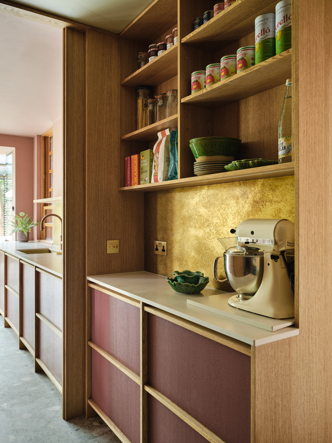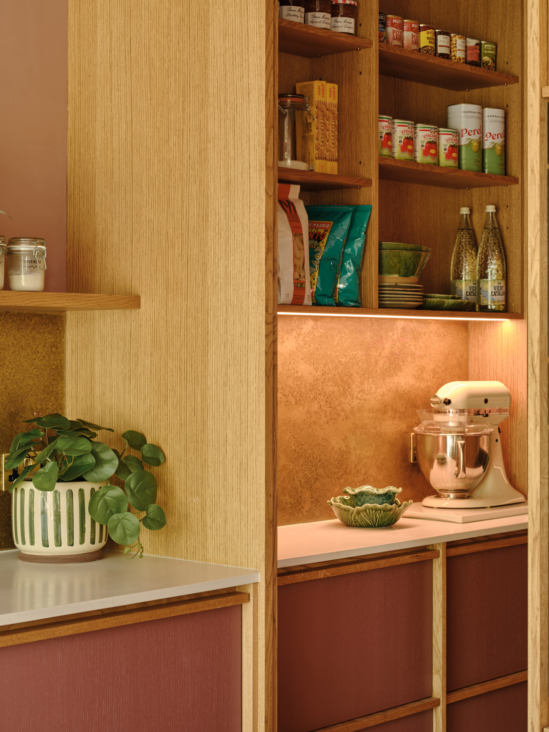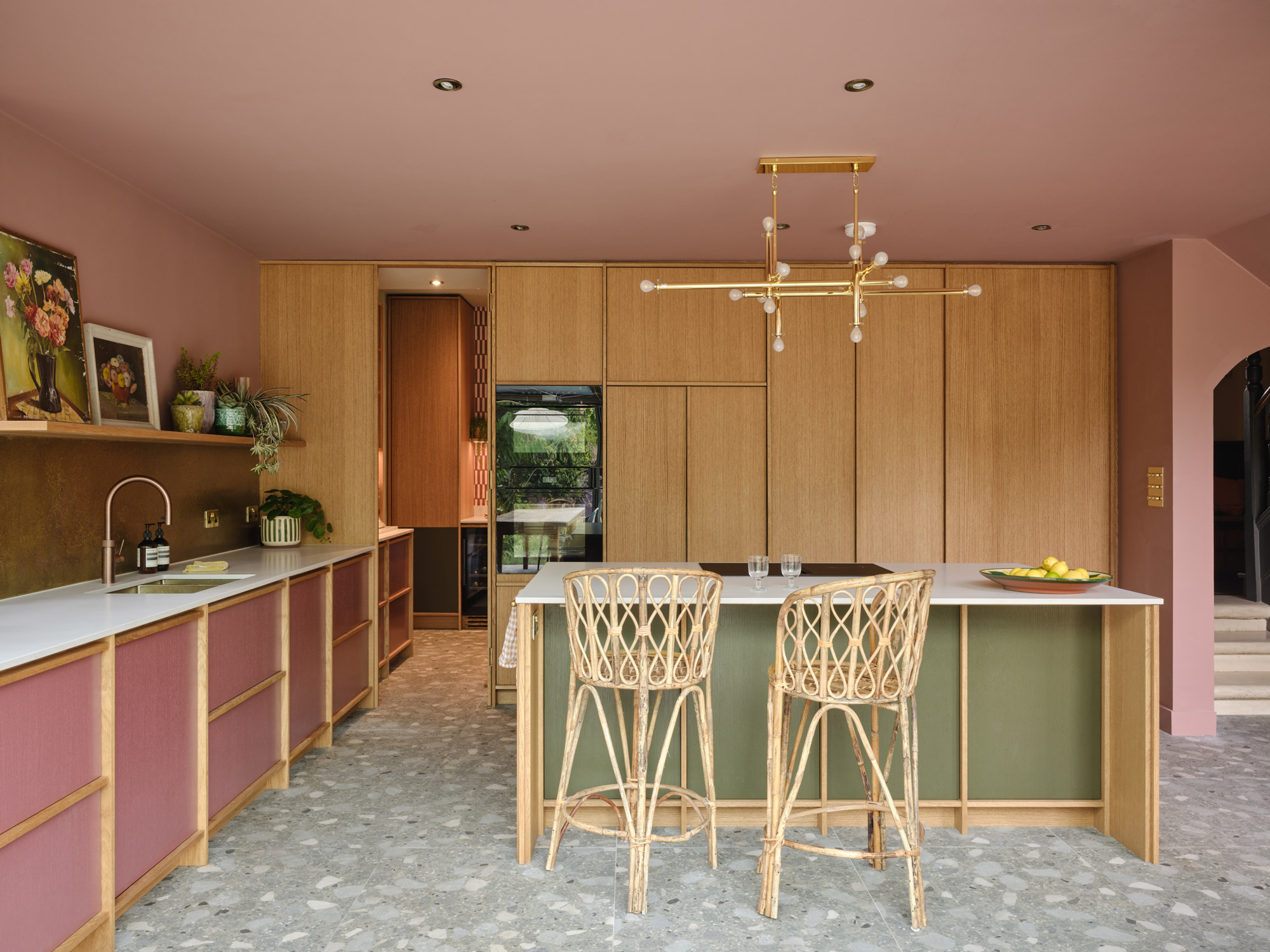 This bold & brilliant kitchen completes a full-house redesign we’ve been working on over the last few years. Midcentury glamour meets modern practicality, with a secret doorway & appliances all hidden within a wall of full-height oak panelling to give a more sophisticated & less ‘kitcheny’ feel to the space.
