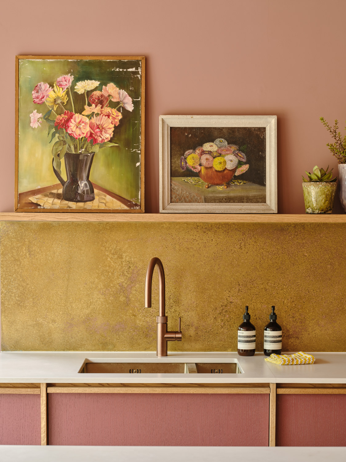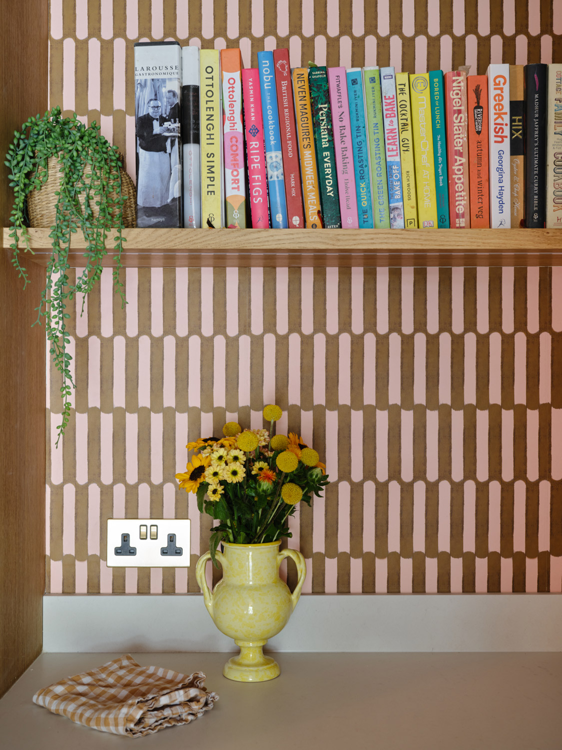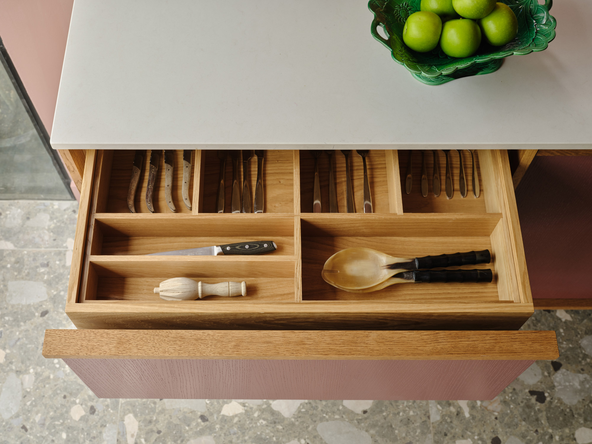 This bold & brilliant kitchen completes a full-house redesign we’ve been working on over the last few years. Midcentury glamour meets modern practicality, with a secret doorway & appliances all hidden within a wall of full-height oak panelling to give a more sophisticated & less ‘kitcheny’ feel to the space.