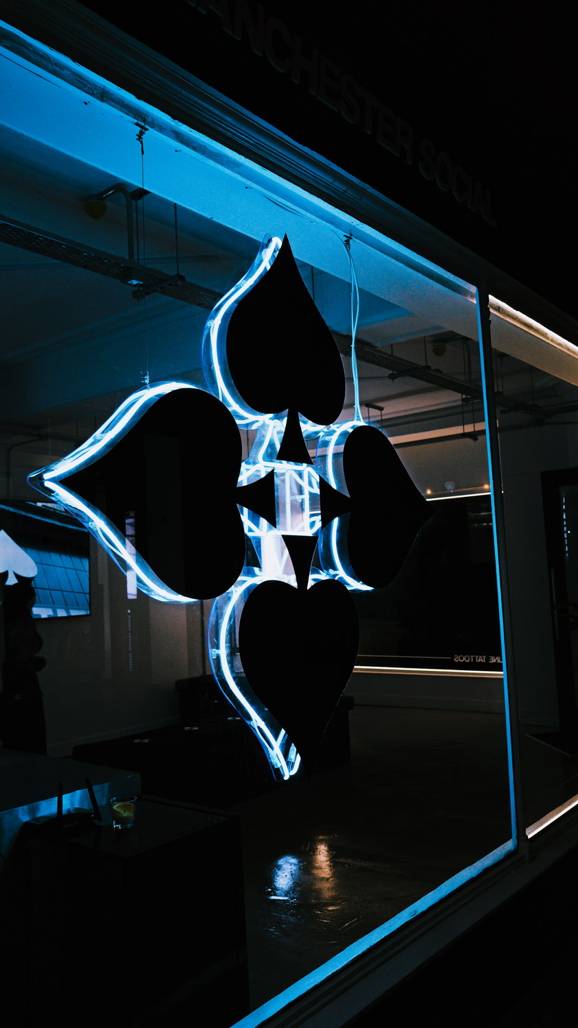 Interesting fact: the brand logo is a Fleur de Spade, a combination of 4 spades that make a flower, inspired by the Patek Philippe Calatrava Cross. We created a super-sized neon version for the shop window for high impact visuals both internally & externally.